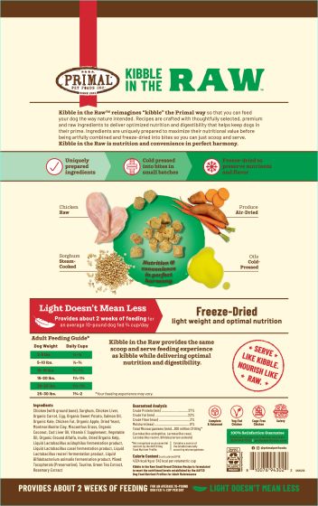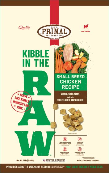 Kibble in the Raw Small Breed Recipe is made with cage-free chicken and organic produce with no synthetic vitamins, minerals or artificial ingredients to provide real, whole food nutrition. Kibble sized bites made high-quality raw chicken are freeze-dried to preserve nutrients and flavor. Experience the same scoop and serve feeding experience as kibble, while delivering optimal nutrition & digestibility for your dog. Serve like kibble. Nourish like raw.