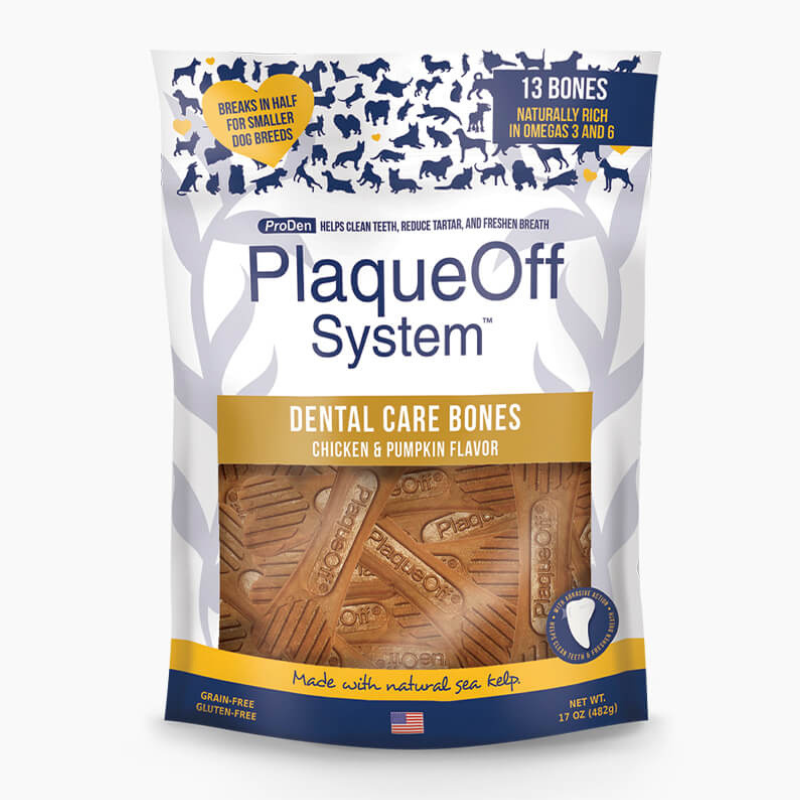 Dental Care Bones are the only chews on the market that contain the 100% natural and clinically proven kelp ingredient A.N ProDen™. Dental Care Bones help oral problems with double action – ProDen PlaqueOff System® and the bone’s unique shape helps to prevent new plaque and tartar from forming when used as directed, resulting in a fresher breath. They also contain omega 3 and 6 fatty acids and antioxidants that support immune health. The Chicken & Pumpkin flavor is suitable for sensitive stomachs and is the perfect reward for your dog to relax with.