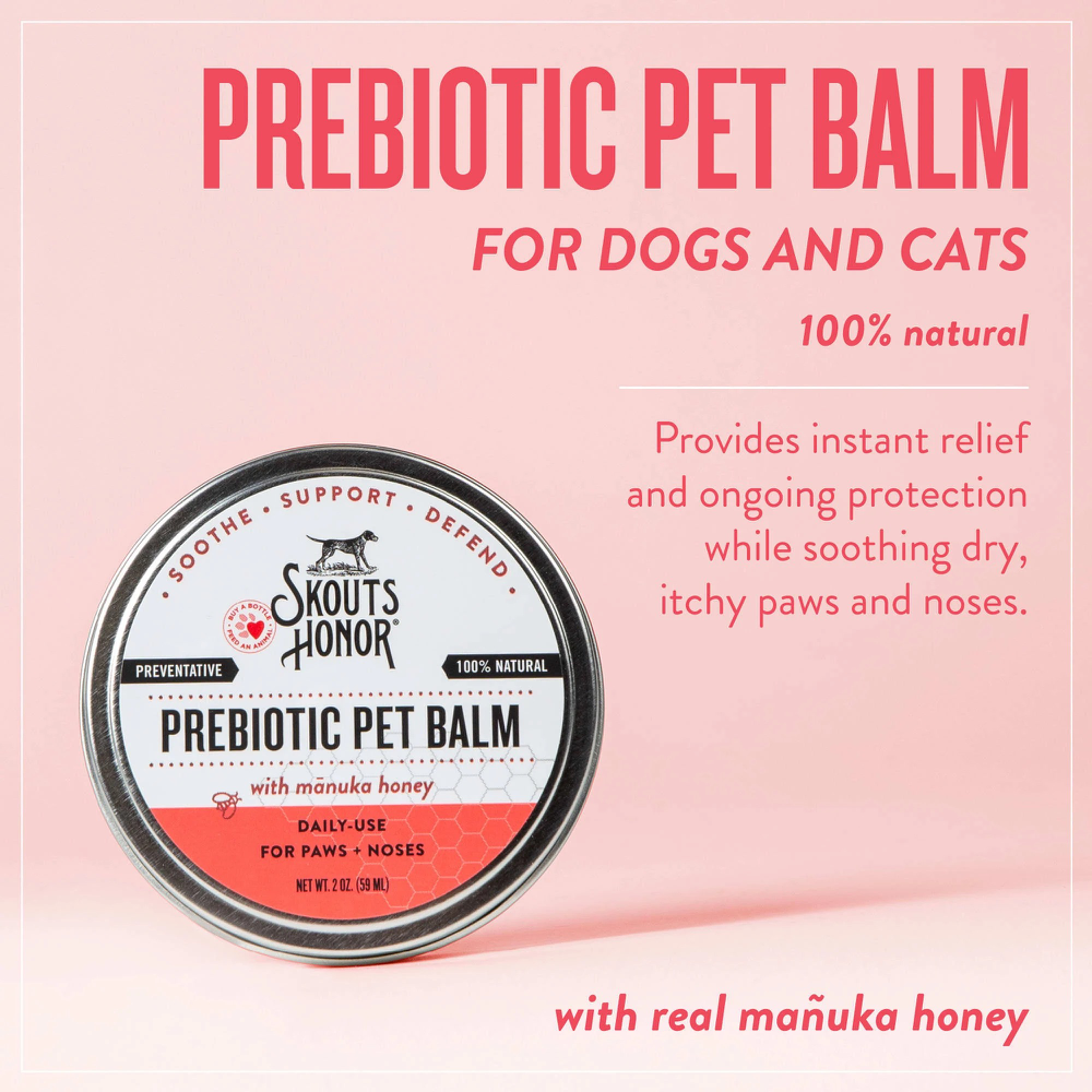 Skout's Honor Prebiotic Pet Balm is a daily use paw and nose protector that soothes, protects, and is non-medicated. This balm contains prebiotic fibers that help provide instant relief and ongoing protection while soothing dry, itchy paws and noses. At Skout's Honor, our goal is simple: curate the best technologies and create products that greatly improve the experience of living with and loving our pets. We are environmentally and socially conscious. Our products exceed the highest level of environmental responsibility and safety standards and perform above and beyond anything else in their category.