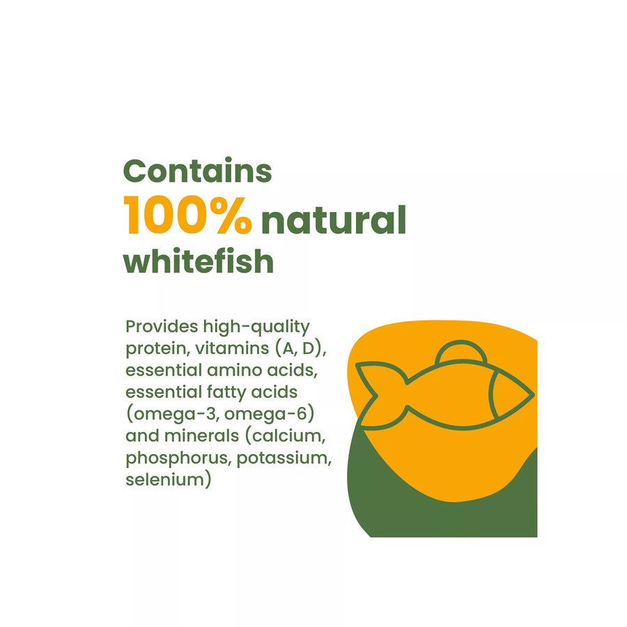 Ingredients: Whitefish 40%, Water Sufficient For Processing 38.6%, mackerel 20%, Tapioca Starch 0.8%, Dehydrated Egg 0.3%, Guar Gum 0.3%.