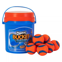 Includes: 1 Reuseable Bucket w/ lid and carry handle, 8 medium Chuckit Balls