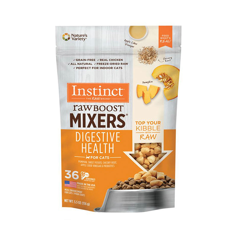 Top your cat's kibble with raw. Instinct® Raw Boost® Mixers® Digestive Health provides fiber and live, natural probiotics to help maintain digestive health. Our recipes combine cage-free chicken plus vibrant, functional, whole-food ingredients - 100% freeze-dried and bursting with flavor and nutrition.