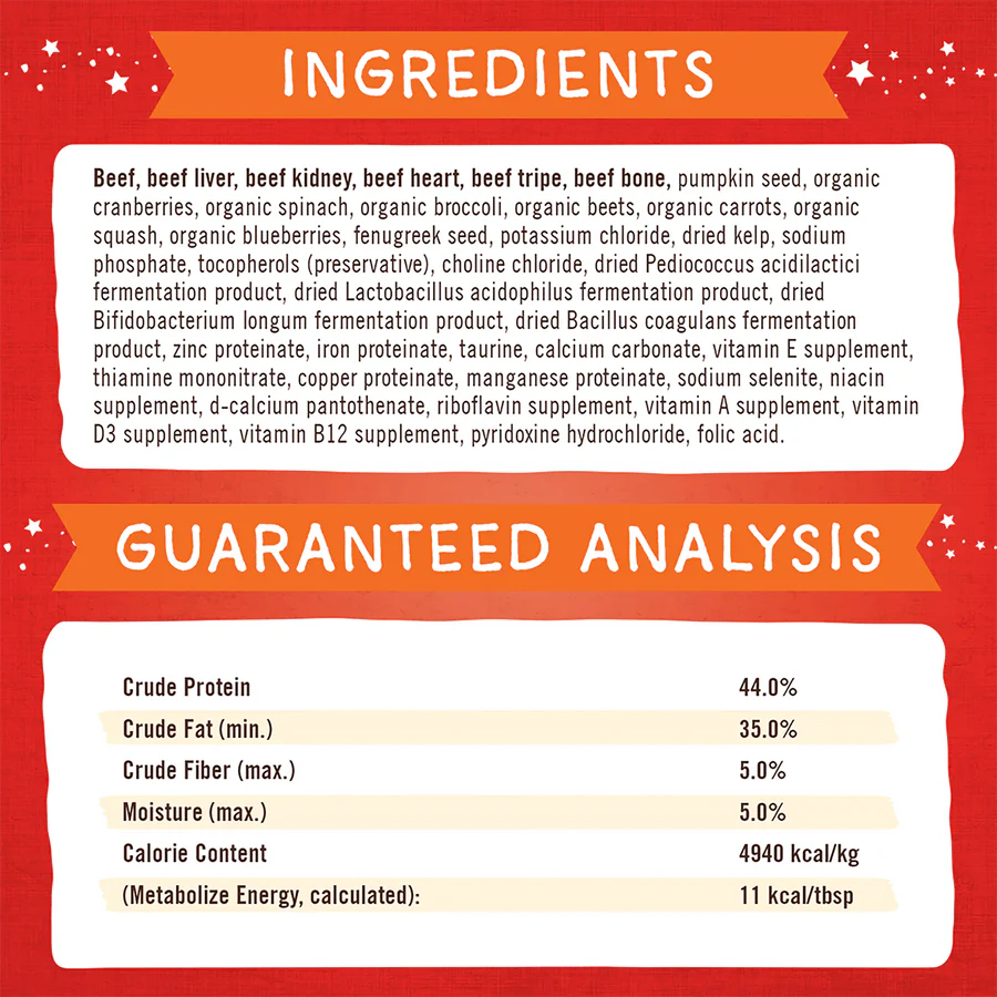 Beef, Beef Liver, Beef Kidney, Beef Heart, Beef Tripe, Beef Bone, Pumpkin Seed, Organic Cranberries, Organic Spinach, Organic Broccoli, Organic Beets, Organic Carrots, Organic Squash, Organic Blueberries, Fenugreek Seed, Potassium Chloride, Dried Kelp, Sodium Phosphate, Mixed Tocopherols (preservative), Choline Chloride, Dried Pediococcus Acidilactici fermentation product, Dried Lactobacillus Acidophilus fermentation product, Dried Bifidobacterium Longum fermentation product, Dried Bacillus Coagulans fermentation product, Zinc Proteinate, Iron Proteinate, Taurine, Calcium Carbonate, Vitamin E Supplement, Thiamine Mononitrate, Copper Proteinate, Manganese Proteinate, Sodium Selenite, Niacin Supplement, D-calcium Pantothenate, Riboflavin Supplement, Vitamin A Supplement, Vitamin D3 Supplement, Vitamin B12 Supplement, Pyridoxine Hydrochloride, Folic Acid.