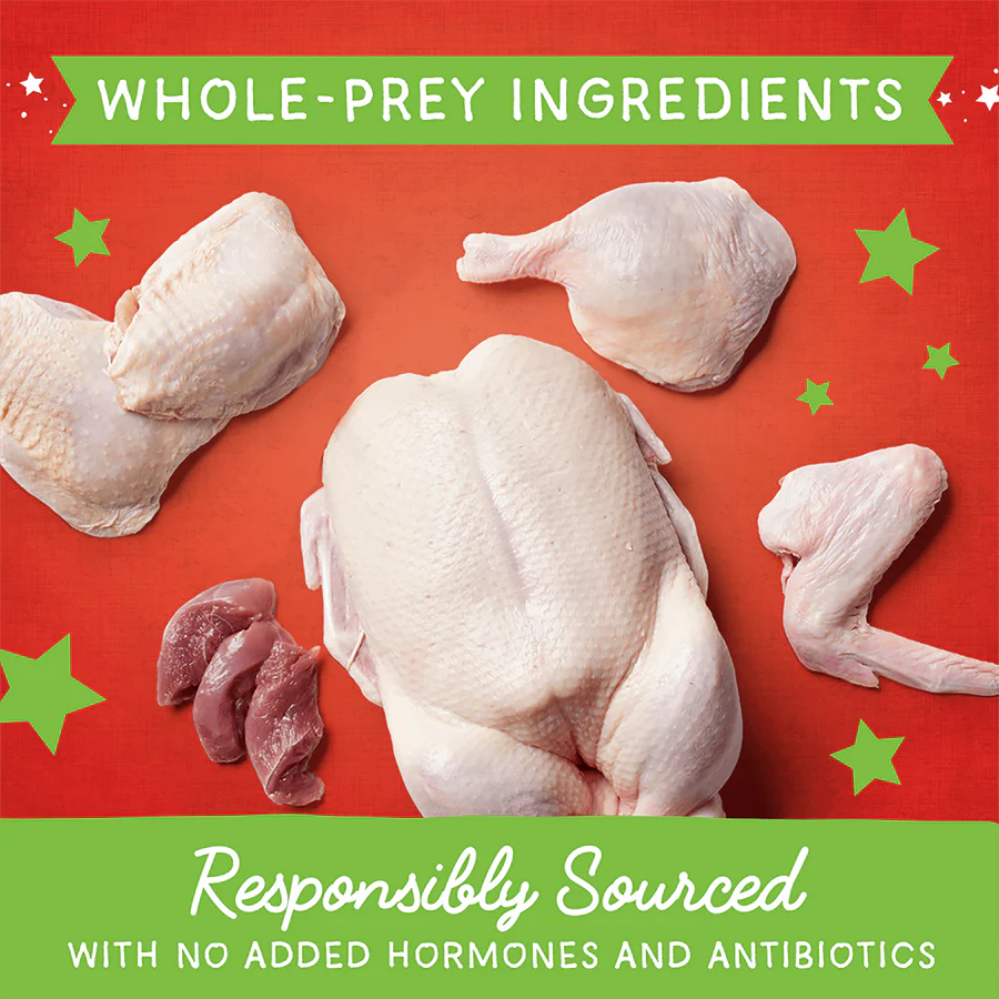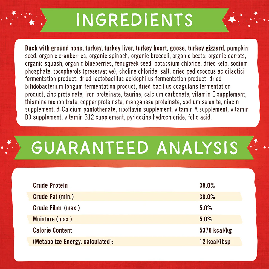 Duck with Ground Bone, Cage-Free Turkey, Turkey Liver, Turkey Heart, Goose, Turkey Gizzard, Pumpkin Seed, Organic Cranberries, Organic Spinach, Organic Broccoli, Organic Beets, Organic Carrots, Organic Squash, Organic Blueberries, Fenugreek Seed, Potassium Chloride, Dried Kelp, Sodium Phosphate, Mixed Tocopherols (preservative), Choline Chloride, Salt, Dried Pediococcus Acidilactici fermentation product, Dried Lactobacillus Acidophilus fermentation product, Dried Bifidobacterium Longum fermentation product, Dried Bacillus Coagulans fermentation product, Zinc Proteinate, Iron Proteinate, Taurine, Calcium Carbonate, Vitamin E Supplement, Thiamine Mononitrate, Copper Proteinate, Manganese Proteinate, Sodium Selenite, Niacin Supplement, D-calcium Pantothenate, Riboflavin Supplement, Vitamin A Supplement, Vitamin D3 Supplement, Vitamin B12 Supplement, Pyridoxine Hydrochloride, Folic Acid.