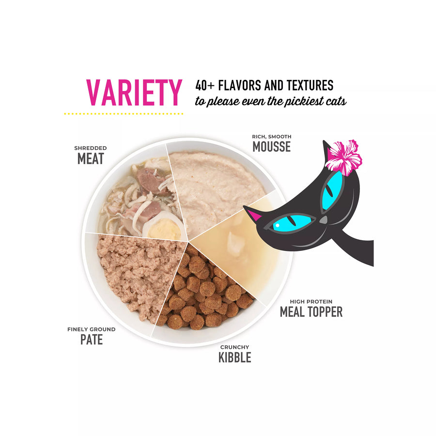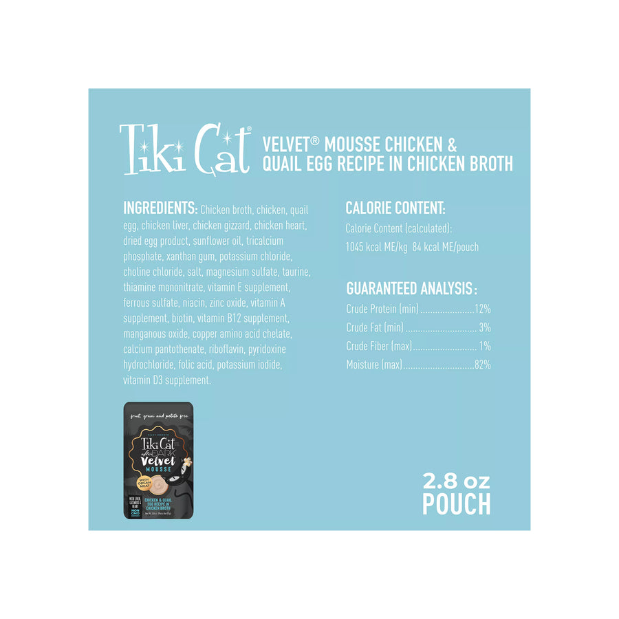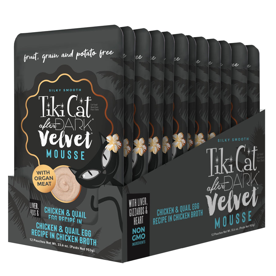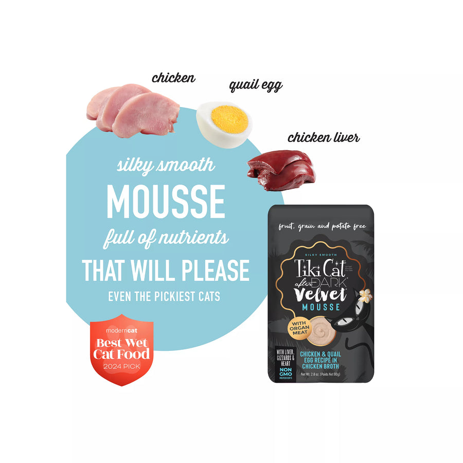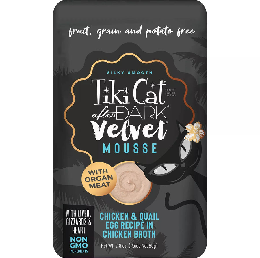 As obligate carnivores, cats have a natural instinct to hunt after dark and a nutritional need to eat meat. Tiki Cat® After Dark® Velvet™ Mousse is a meat-lover’s dream, closely mimicking cats’ natural prey diets in a silky-smooth mousse form.