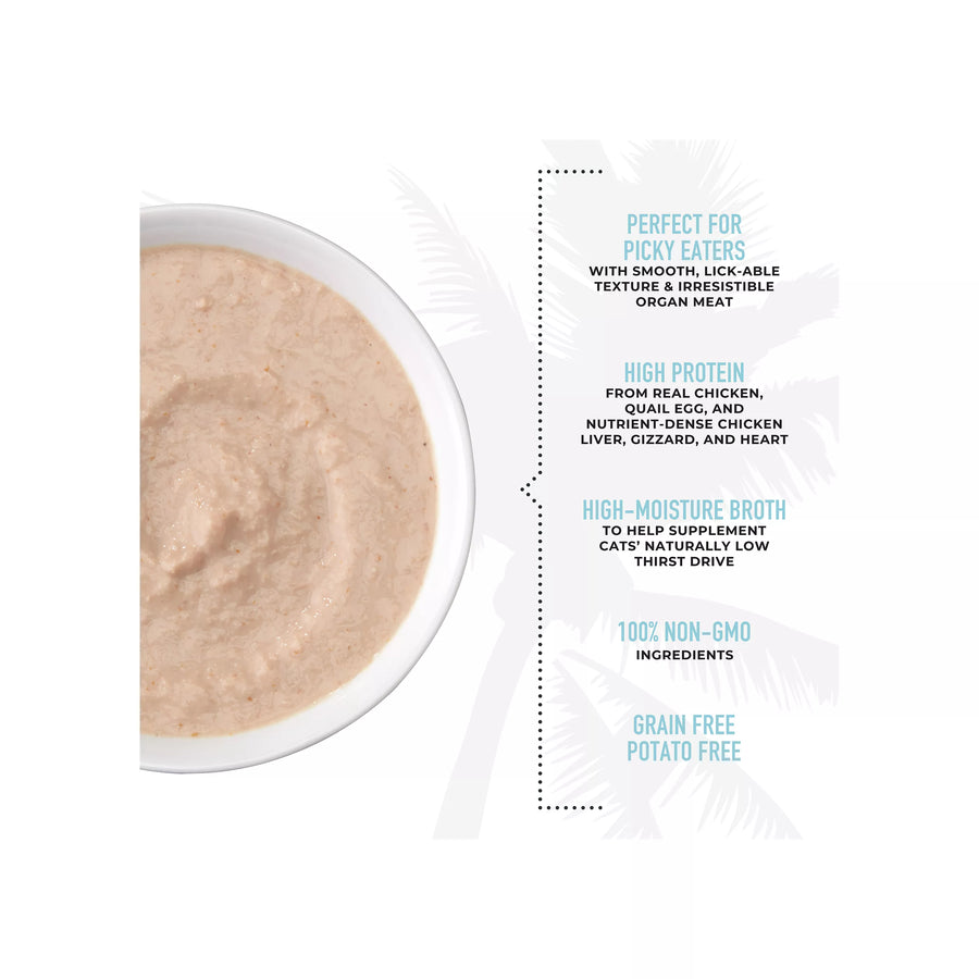 Chicken broth, chicken, quail egg, chicken liver, chicken gizzard, chicken heart, dried egg product, sunflower oil, tricalcium phosphate, xanthan gum, potassium chloride, choline chloride, salt, magnesium sulfate, taurine, thiamine mononitrate, vitamin E supplement, ferrous sulfate, niacin, zinc oxide, vitamin A supplement, biotin, vitamin B12 supplement, manganous oxide, copper amino acid chelate, calcium pantothenate, riboflavin, pyridoxine hydrochloride, folic acid, potassium iodide, vitamin D3 supplement.