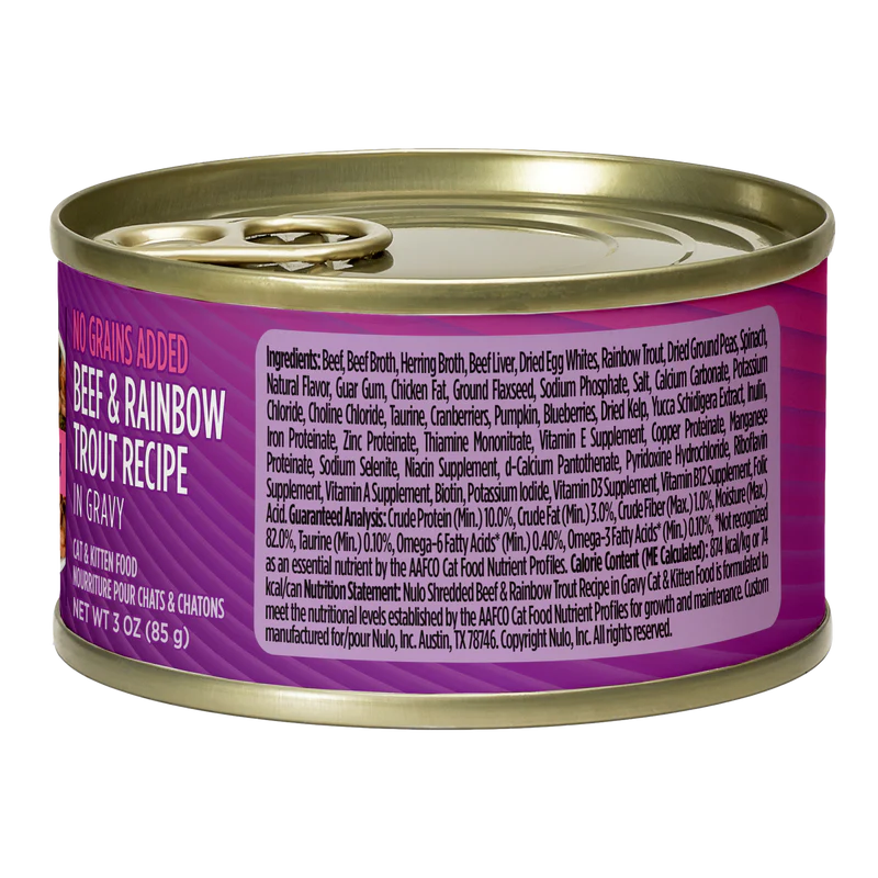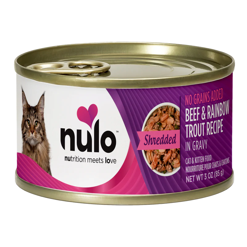 Nulo shredded beef & rainbow trout recipe in gravy is formulated to meet the nutritional levels established by the AAFCO Cat Food Nutrient Profiles for all life stages.