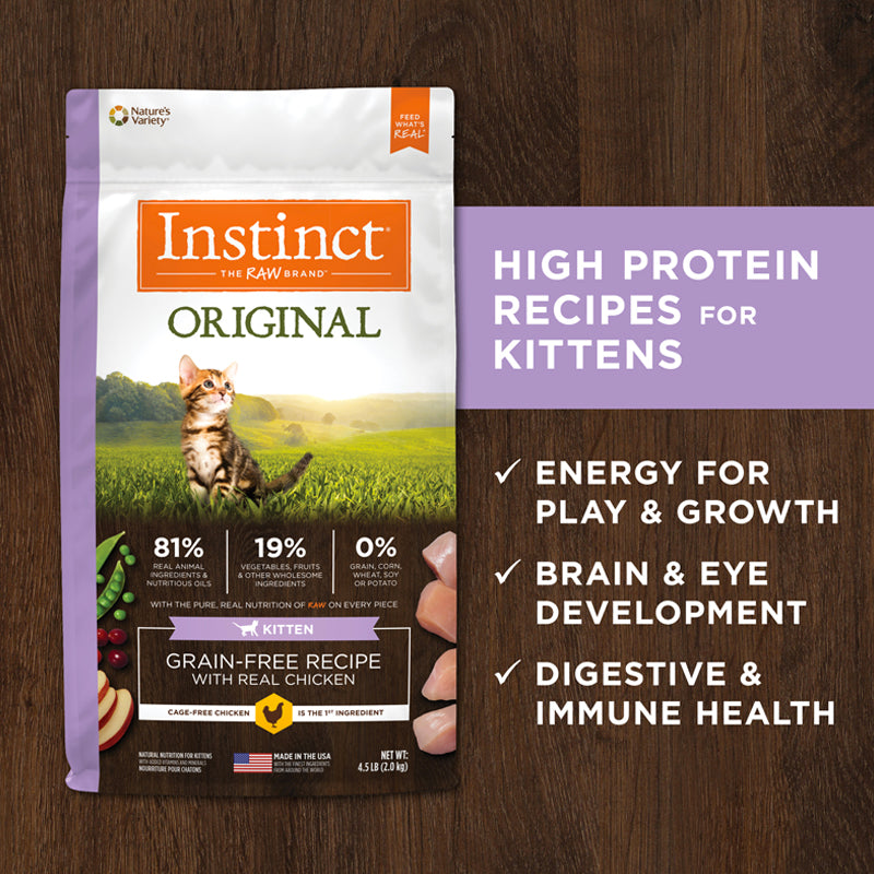 高动物蛋白,无谷物配方,在我们生的信念的指导下,特别为你的小猫制作,Instinct 百利 ,原味无谷物配方与真正的鸡肉为小猫释放潜能,茁壮成长。