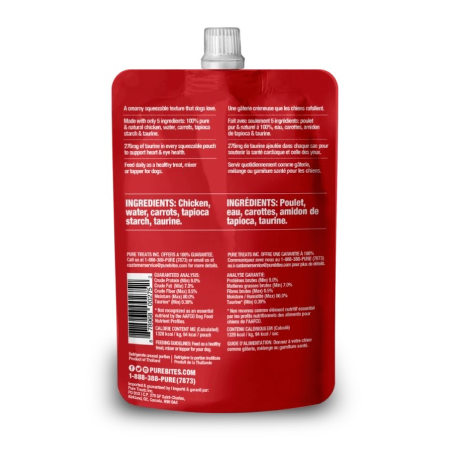 - Turn the pouch around and look at our ingredients. Made with only 5 ingredients: 100% pure chicken, water, carrots, tapioca starch, & taurine. Proudly sourced and made in Thailand with human grade ingredients
