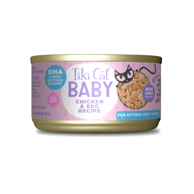 Kittens are born carnivores, but they also have very specific nutritional needs. With increasing energy, developing digestive and immune systems, and growing bodies, they need nutrition designed just for them. Tiki Cat Baby Chicken & Egg Recipe gives kittens their best start, with high protein and fat to support early growth and DHA to promote healthy brain development, in a soft, flavorful formula.